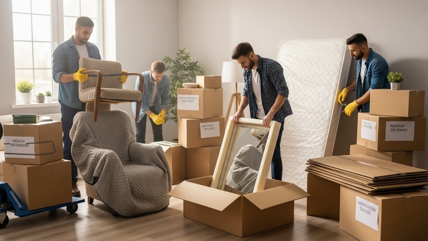 يبدأ الفريق بفك الأثاث وتغليفه بعناية لضمان حمايته أثناء النقل.