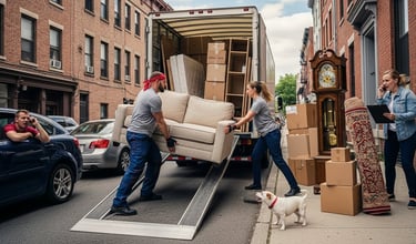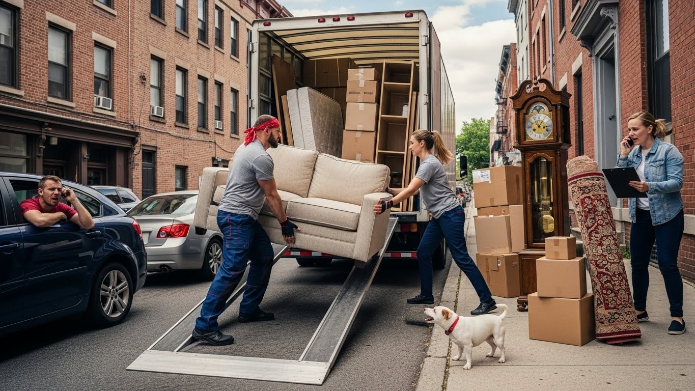 يتم نقل الأثاث بأمان باستخدام سيارات مجهزة ورافعات عند الحاجة.